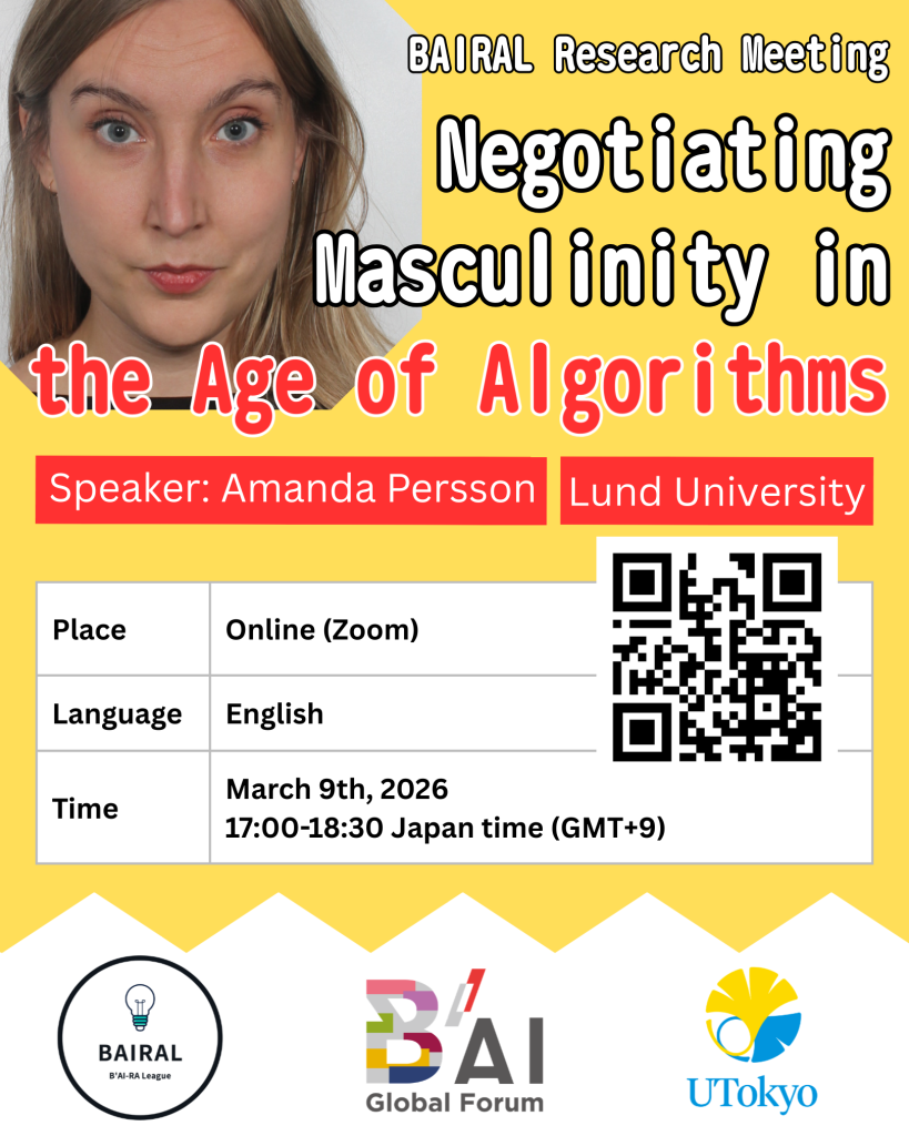 BAIRAL is a study group by young research assistants (RA) of the B’AI Global Forum of the Institute for AI and Beyond at the University of Tokyo. Aiming to achieve gender equality and a guarantee of rights for minorities in the AI era, this study group examines relationships between digital information technology and society. BAIRAL organizes research meetings every other month with guest speakers in a variety of fields.