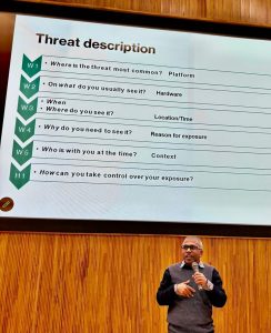 Perera encouraged participants to recall a specific threat they had encountered and to write out the 5W1H for that incident. The countermeasures do not need to be elaborate—simple, self‑directed actions are sufficient. For example, blocking the perpetrator may be enough. In his own case, when a digitally manipulated image of him was circulated on Facebook for commercial purposes, he contacted Facebook staff directly and had it removed when the platform’s machine reliant moderation mechanism failed.
